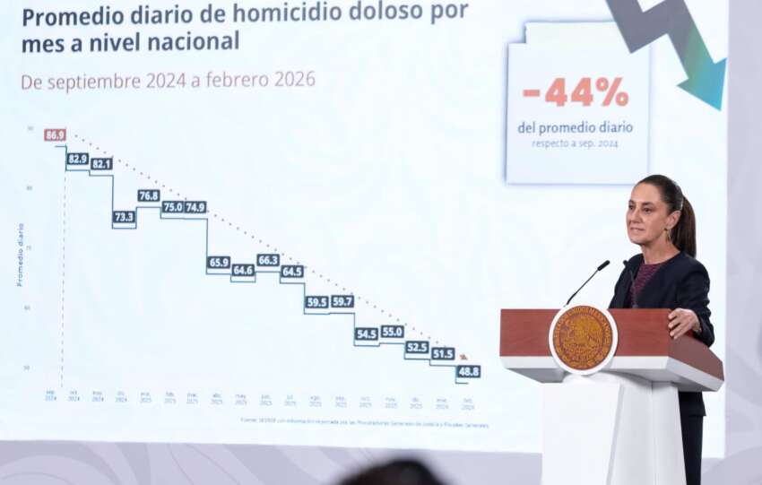 La presidenta de México, Claudia Sheinbaum Pardo , informó que los homicidios dolosos en el país registraron una reducción del 44 por ciento entre septiembre de 2024 y febrero de 2026, al pasar de un promedio diario de 86.9…